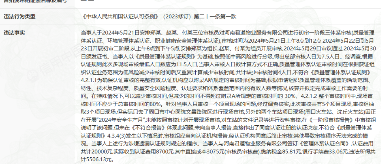 认证审核“缩水”4人日,一认证机构被罚5万元!